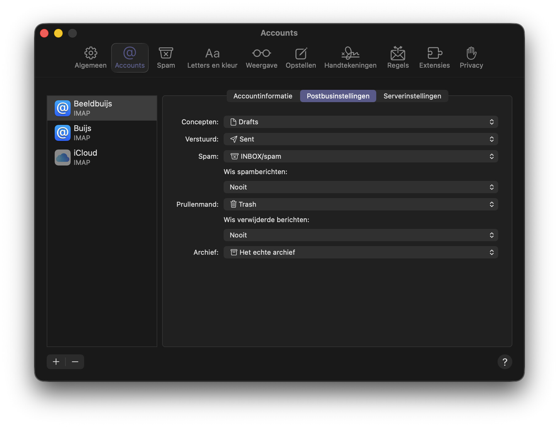 It’s even weirder. On both the Mac and iPhone, the Archive mailbox is set to the Het echte archief mailbox. On the Mac however, the archived mails can be found in the mailbox named Archief (Dutch for Archive), while on the iPhone, the same archived mails can be found in the mailbox named Het echte archief.