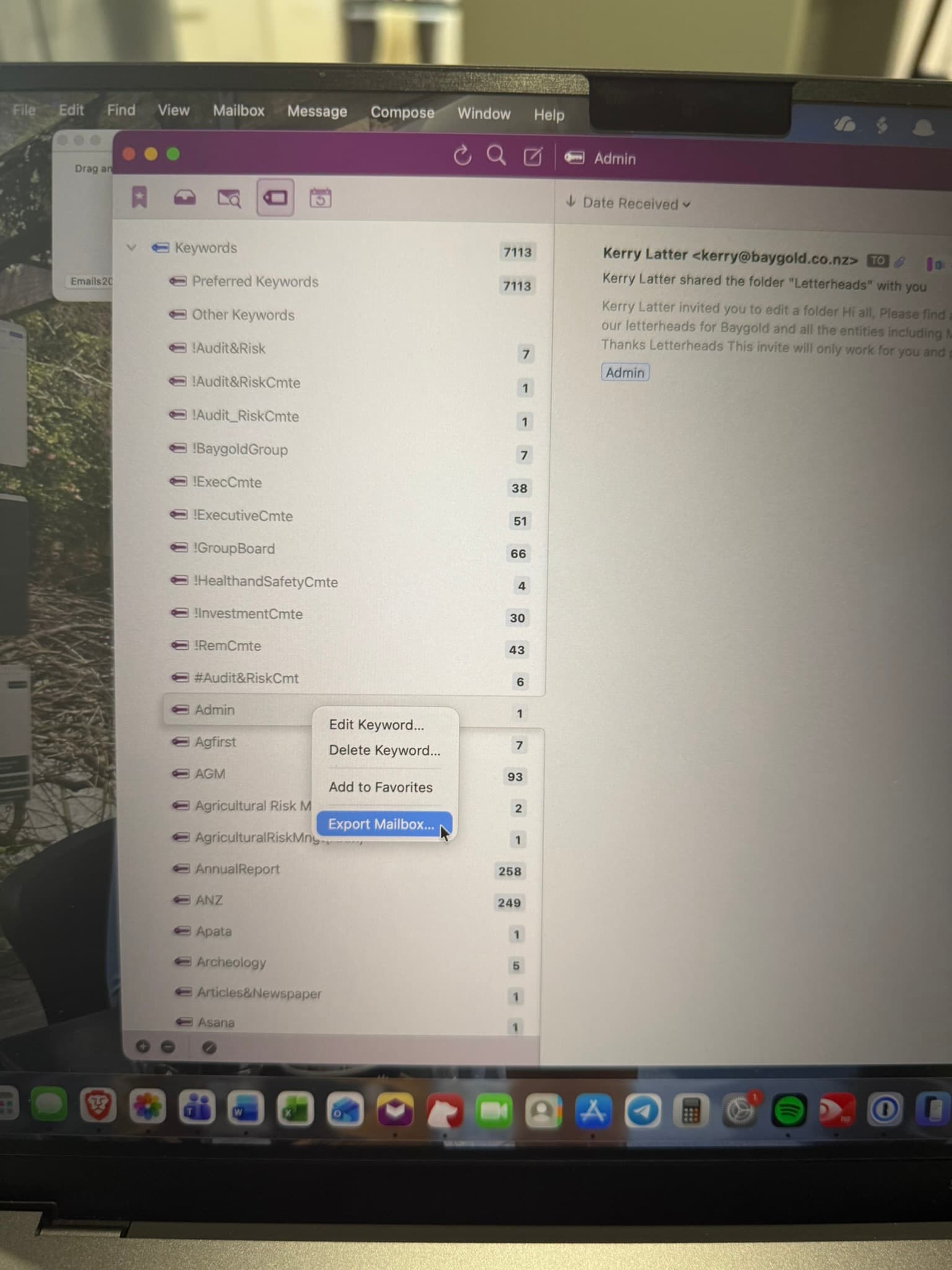 Ok, I have played around some more. It looks like what I did to get that MBOX with the Keywords: header was to extract the MBOX file from the Tags list in the left hand pane. It works whether you select a specific tag/keyword from this list or select the “Keywords” heading.