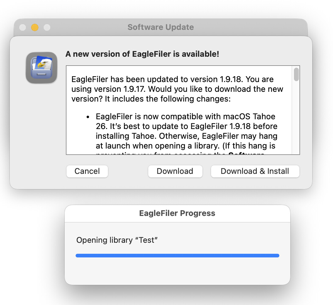 EagleFiler 1.9.17 and earlier will hang when opening a library on macOS Tahoe 26. You can hold down the Shift key when launching the old version of EagleFiler to prevent it from re-opening any libraries so that you can do the software update to EagleFiler 1.9.18.