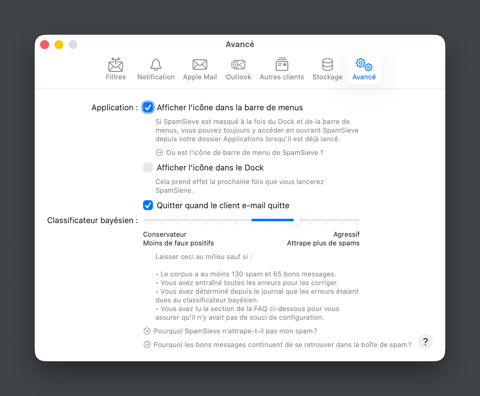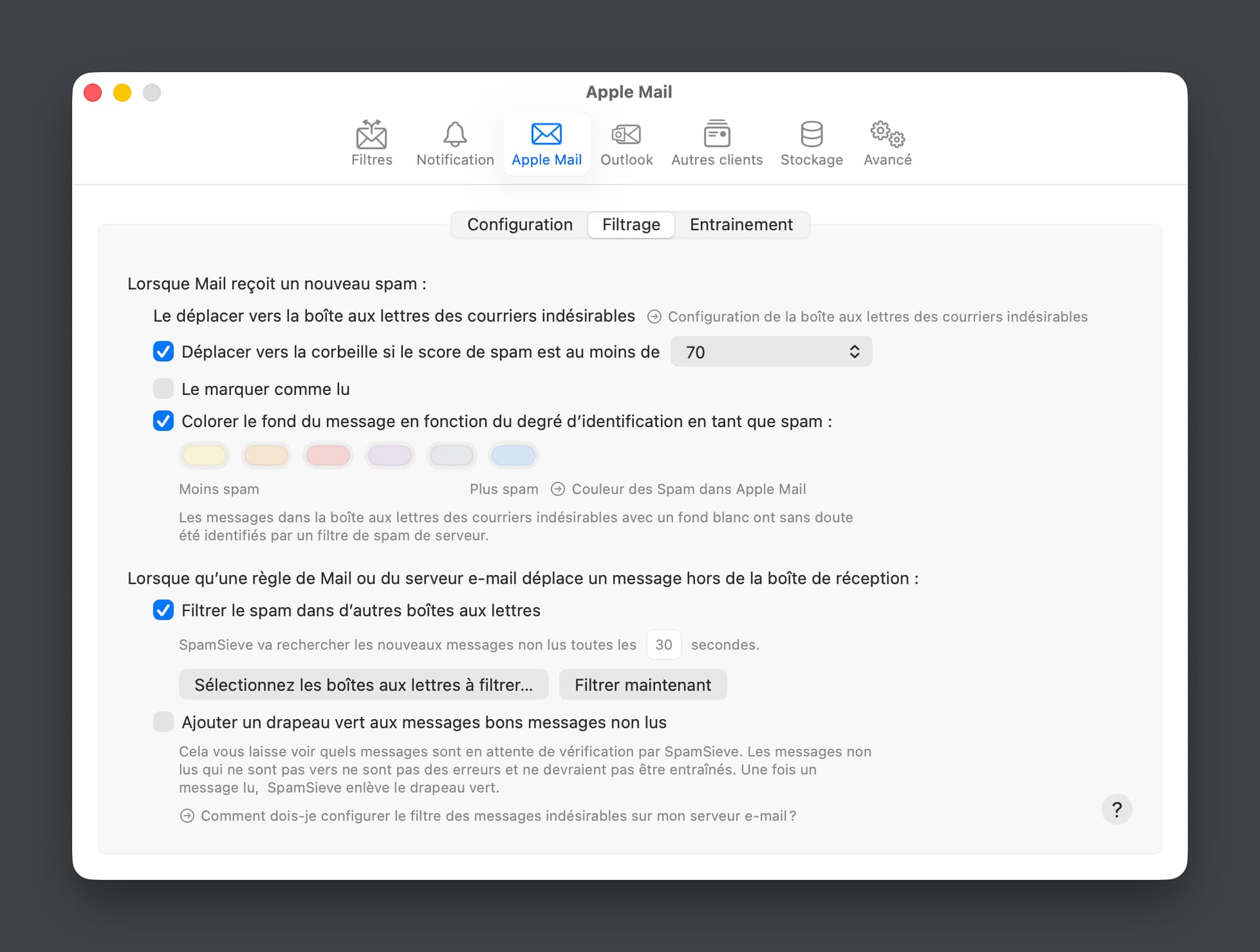 -Emails placed in the junk folder are color-coded by SpamSieve.