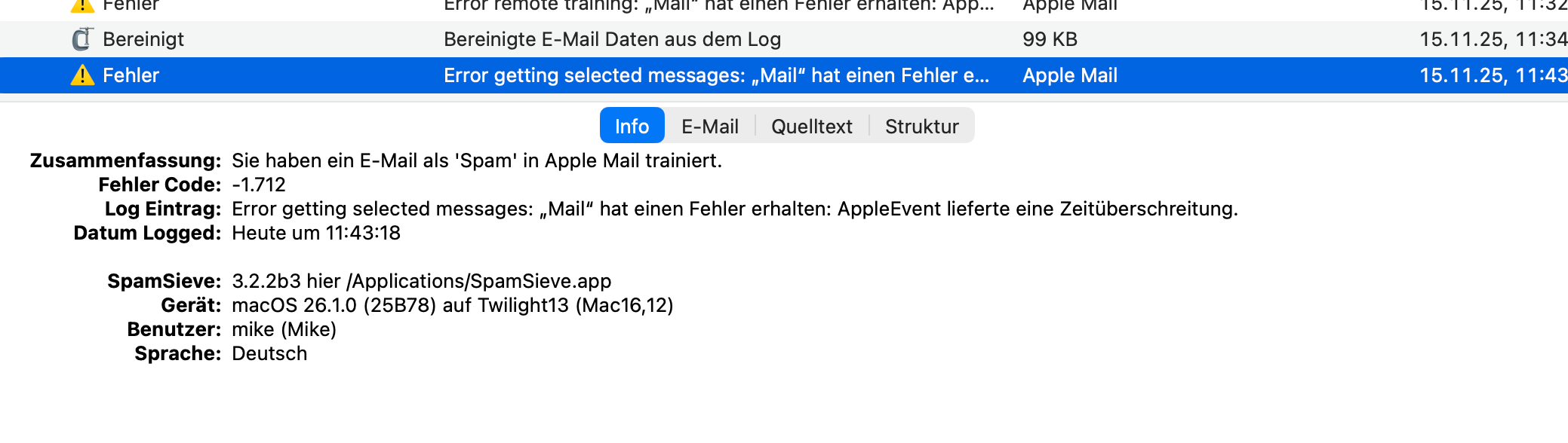 Thanks for sending the diagnostic report. It looks like the settings were not correct. You have Disable spam filtering in Apple Mail selected here: