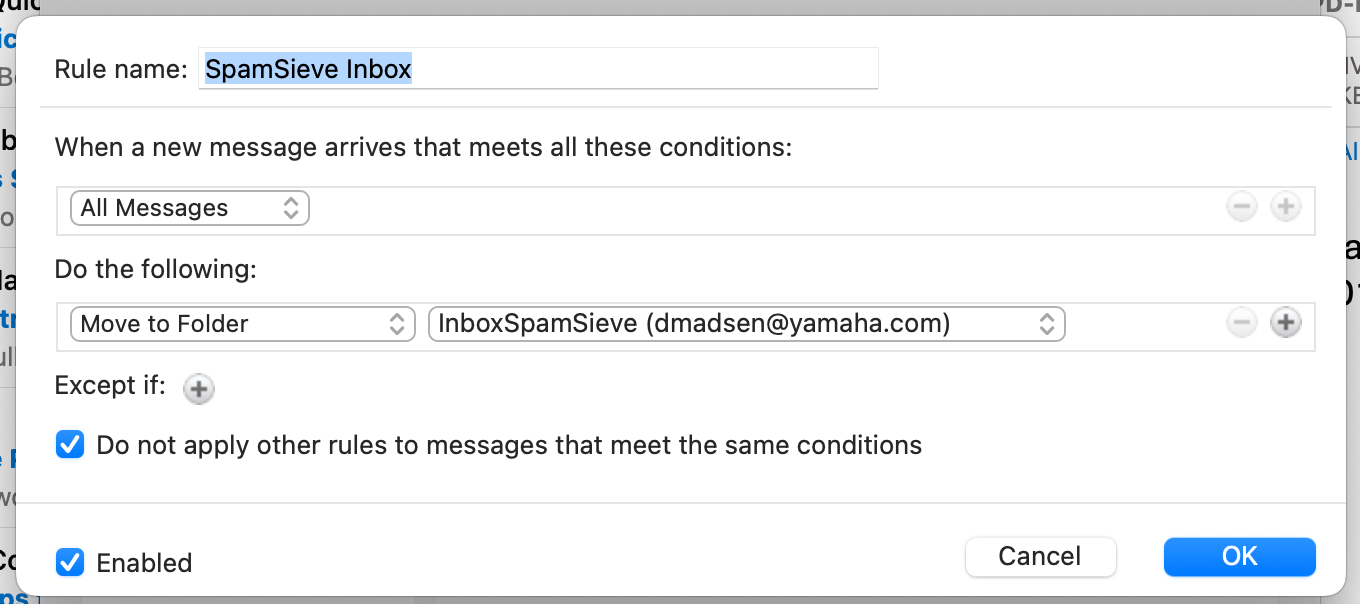 But now my other Rules for auto-sorting certain emails into specific folders aren’t working. I’ll try unchecking “Do not apply other Rules…” option on the InboxSpamSieve Rule.