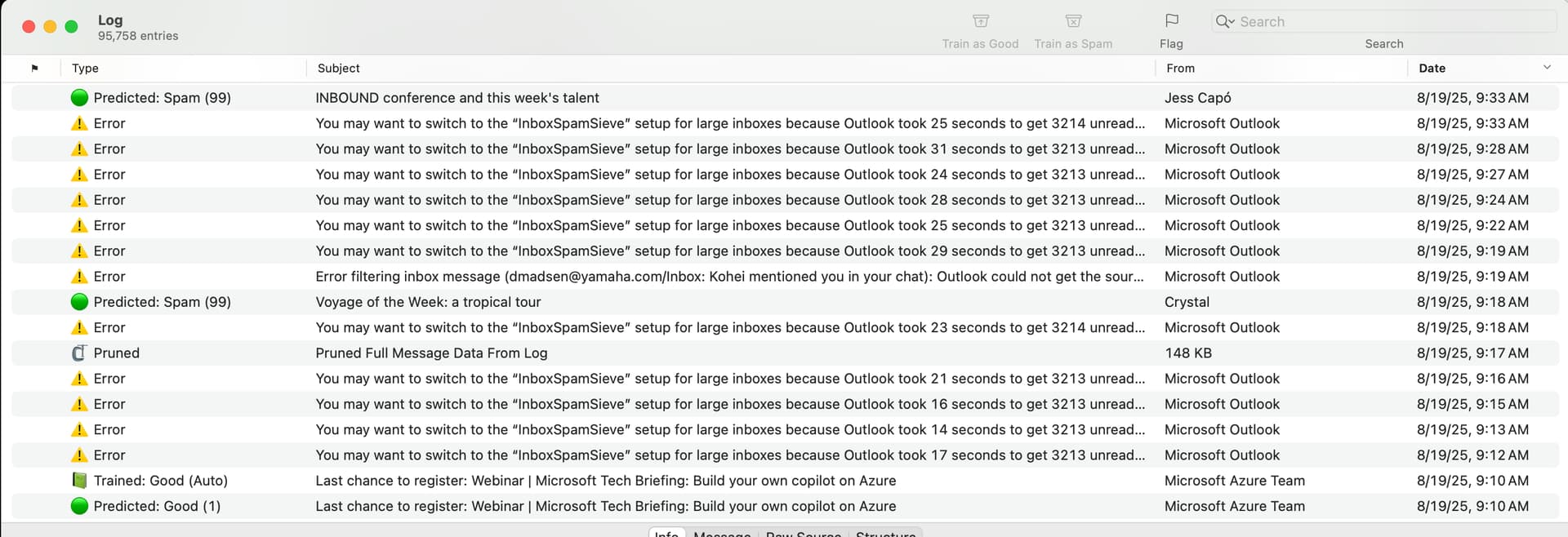 Regardless, yesterday I went through some setup steps. There are thousands of emails in my Junk folder (whether they were there before yesterday or not it’s hard to say). But to your point about yesterday’s Log screenshot, the Large Inbox error was by far the most frequent error log before yesterday. In Today’s Log, that error doesn’t show at all so I may have done something right.