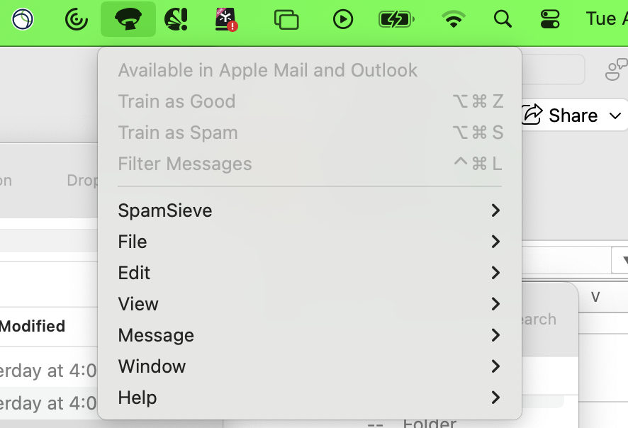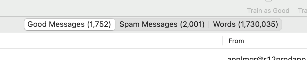 The SpamSieve drop-down menu has “Train as Spam” and “Train as Good” grayed out (not selectable). But I have an older corpus on my machine with thousands of Good and Spam messages. My perception is this shouldn’t matter if Rules don’t move emails to the InboxSpamSieve folder.