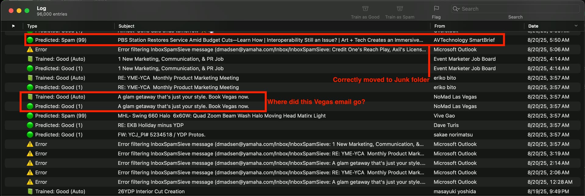 That new Log shows that a 5:50am email from AVTechnologySmartBrief was correctly predicted as Spam… and I’ve confirmed it’s in the Junk folder (yay!). Please ignore that question in the screenshot about the Vegas email… I found it… it was from a different time of day than the log.