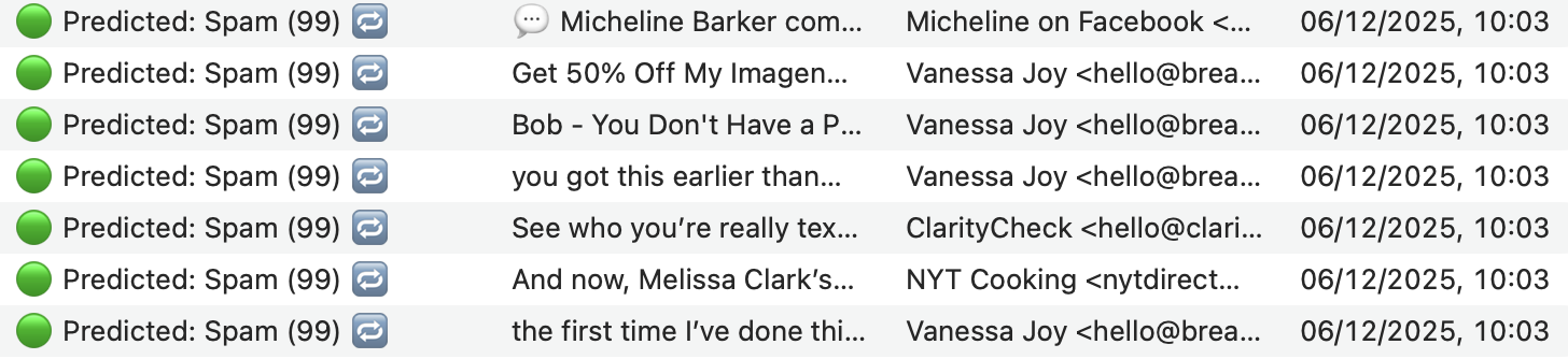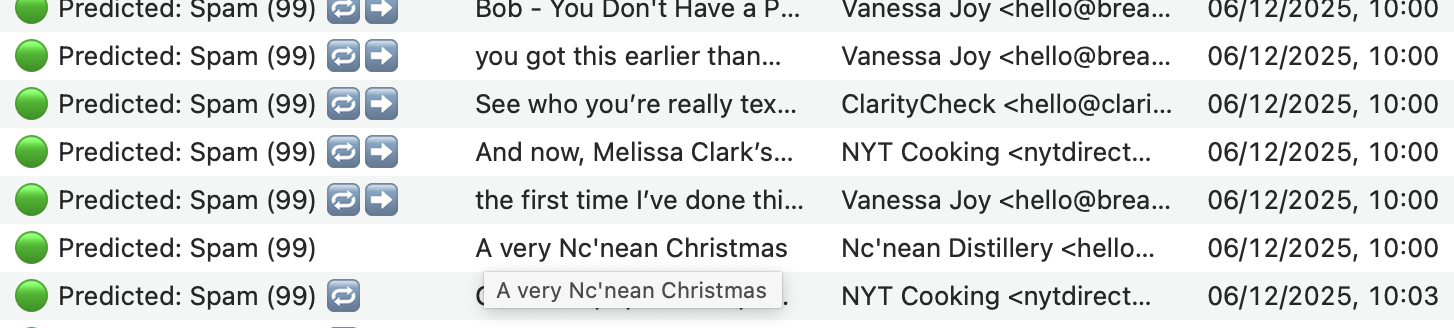 I have messages that Spamsieve has categorised as spam appearing back to my inbox. I assume SS is doing this. Within a few minutes, they are removed from my inbox. Some of that spam comes back several times. The spam messages are khaki coloured, some marked as read, most not.