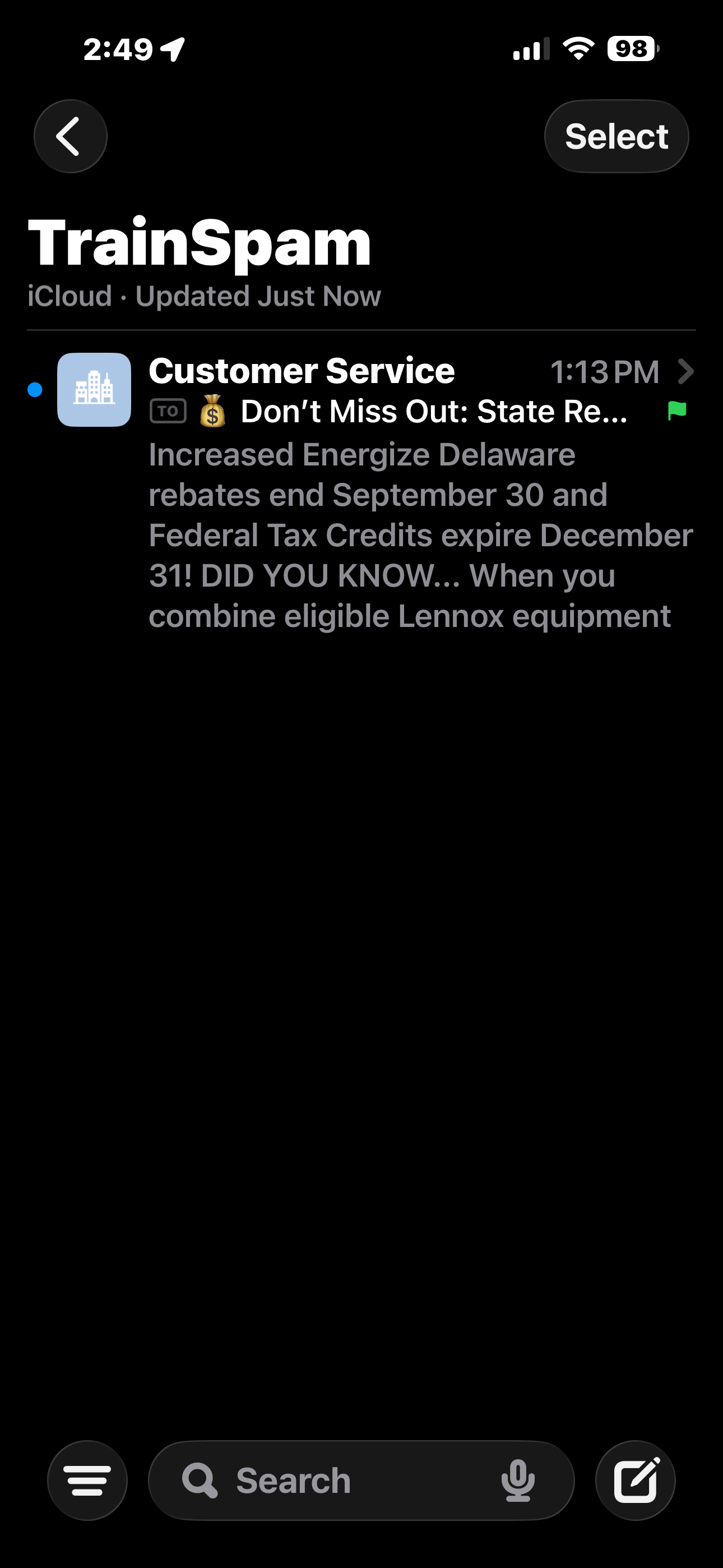 Thanks Michael. It’s working well. Only thing I’m finding that is odd: when I move a message to either TrainSpam or TrainGood, it ends up correctly in the appropriate folders (Spam or Inbox, respectively), but on my iPhone running the release candidate for iOS 26, the messages are moved but a copy remains in these Training mailboxes. On my Mac (running Tahoe), the folders are empty once the emails have been appropriately moved by SpamSieve. Easy enough to delete the duplicated emails from the Training mailboxes, but is there any reason why copies remain in these training folders in iOS 26 after SpamSieve has relocated them, but not so in macOS 26? Thanks!