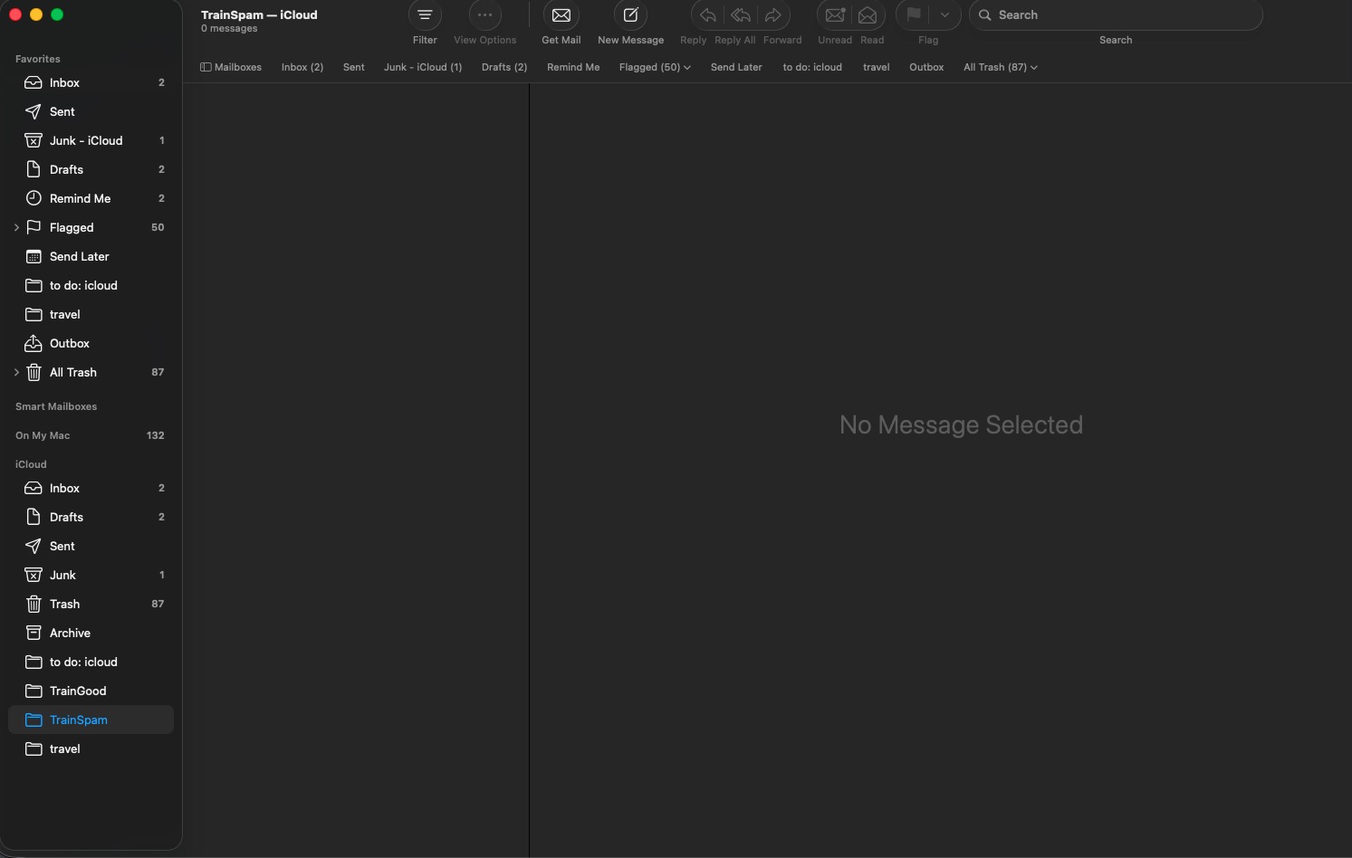iCloud webmail shows the same as macOS: both training folders are empty (correct). My iPhone still shows TrainSpam with the junk email that was already moved to my Spam folder (and it is there as well in my iPhone’s spam folder).