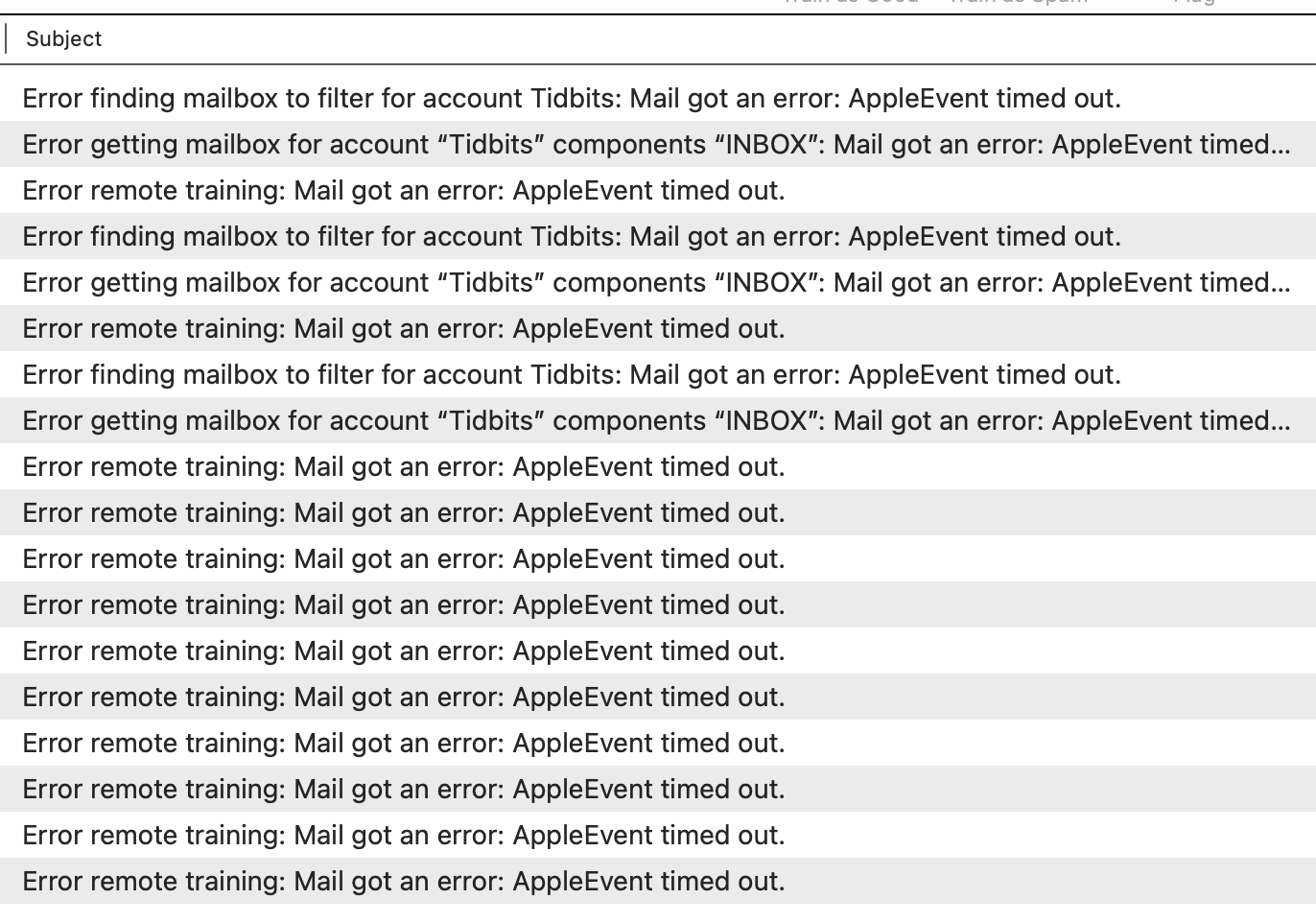 It’s unclear to me why Mail is taking so long to respond that AppleScript is timing out. When you see something like “Error finding mailbox to filter,” it’s just looking up the account and then mailbox by name. Those should both be very quick operations, though I think you were also getting timeouts listing the inboxes of your accounts. So something weird is going on. If it happens again, please record a sample from Mail.